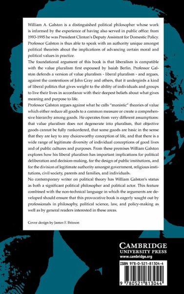 William Galston is a distinguished political philosopher whose work is informed by the experience of having also served from 1993-5 as President Clinton's Deputy Assistant for Domestic Policy. He is thus able to speak with an authority unique amongst political theorists about the implications of advancing certain moral and political values in practice. The foundational argument of this 2002 book is that liberalism is compatible with the value pluralism first espoused by Isaiah Berlin. William Galston defends a version of value pluralism - liberal pluralism - and argues, against the contentions of John Gray and others, that it undergirds a kind of liberal politics that gives weight to the ability of individuals and groups to live their lives in accordance with their deepest beliefs about what gives meaning and purpose to life.