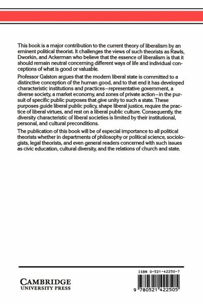 This book is a major contribution to the current theory of liberalism by an eminent political theorist. It challenges the views of such theorists as Rawls, Dworkin, and Ackerman who believe that the essence of liberalism is that it should remain neutral concerning different ways of life and individual conceptions of what is good or valuable. Professor Galston argues that the modern liberal state is committed to a distinctive conception of the human good, and to that end has developed characteristic institutions and practices--representative governments, diverse societies, market economies, and zones of private action--in the pursuit of specific public purposes that give unity to the liberal state. These purposes guide liberal public policy, shape liberal justice, require the practice of liberal virtues, and rest on a liberal public culture. Consequently the diversity characteristic of liberal societies is limited by their institutional, personal, and cultural preconditions.