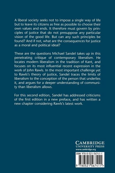 Sandel locates modern liberalism in the tradition of Kant, and focuses on its most influential recent expression in the work of John Rawls. In the most important challenge yet to Rawls' theory of justice, Sandel traces the limits of liberalism to the conception of the person that underlies it, and argues for a deeper understanding of community than liberalism allows.