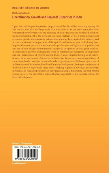 Upon the backdrop of impressive progress made by the Indian economy during the last two decades after the large-scale economic reforms in the early 1990s, this book evaluates the performance of the economy on some income and non-income dimensions of development at the national, state and sectoral levels. It examines regional economic growth and inequality in income originating from agriculture, industry and services. In view of the importance of the agricultural sector, despite its declining share in gross domestic product, it evaluates the performance of agricultural production and the impact of agricultural reforms on spatial integration of food grain markets. It studies rural poverty, analyzing the trend in employment, the trickle-down process and the inclusiveness of growth in rural India. It also evaluates the impact of microfinance, as an instrument of financial inclusion, on the socio-economic conditions of rural households. Lastly, it examines the relative performance of fifteen major states of India in terms of education, health and human development. An important feature of the book is that it approaches these issues, applying rigorously advanced econometric methods, and focusing primarily on their regional disparities during the post-reform period vis-à-vis the pre-reform period. It offers important results to guide policies for future development.