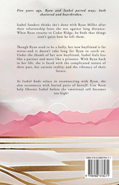 Five years ago, Ryan and Izabel parted ways, both shattered and heartbroken. Izabel Sanders thinks she's done with Ryan Miller after their relationship loses the war against long distance. When Ryan returns to Cedar Ridge, he finds that things aren't quite how he left them. Though Ryan used to be a bully, her new boyfriend is far worse-and it doesn't take long for Ryan to catch on. Under the thumb of her new boyfriend, Izabel feels less like a partner and more like a prisoner. With Ryan back in her life, she is faced with the complicated nature of their past, her current reality, and the vibrancy of their future. As Izabel finds solace in reconnecting with Ryan, she also reconnects with buried parts of herself. Can Ryan help liberate Izabel before the emotional toll becomes too high?