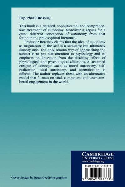 This is the most detailed, sophisticated, and comprehensive treatment of autonomy currently available. Moreover it argues for a quite different conception of autonomy from that found in the philosophical literature. Professor Berofsky claims that the idea of autonomy as origination in the self is a seductive but ultimately illusory one. The only serious way of approaching the subject is to pay due attention to psychology and its emphasis on liberation from the disabling effects of physiological and psychological afflictions. A sustained critique of concepts such as moral autonomy, self-realization, ideal autonomy, and identification is offered. The author replaces these with an alternative model that focuses on vital, competent, and unencumbered engagement in the world.
