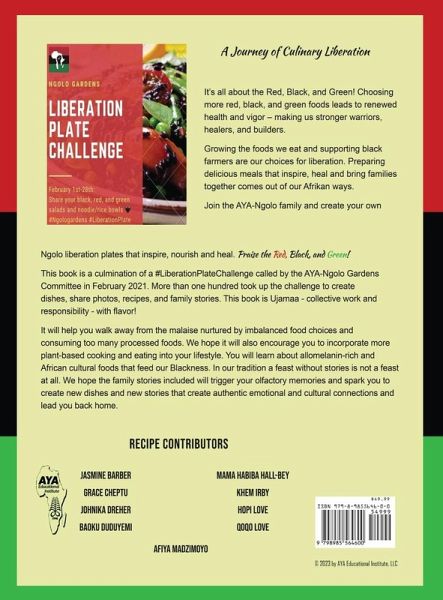 A Journey of Culinary Liberation! It's all about the Red, Black, and Green! Choosing more red, black, and green foods leads to renewed health and vigor - making us stronger warriors, healers, and builders. Growing the foods we eat and supporting black farmers are our choices for liberation. Preparing delicious meals that inspire, heal and bring families together comes out of our Afrikan ways. Join the AYA-Ngolo family and create your own Ngolo liberation plates that inspire, nourish, and heal. Praise the Red, Black, and Green! This book is a culmination of a #LiberationPlateChallenge called by the AYA-Ngolo Gardens Committee in February 2021. More than one hundred took up the challenge to create dishes and share photos, recipes, and family stories. This book is Ujamaa - collective work and responsibility - with flavor! It will help you walk away from the malaise nurtured by imbalanced food choices and our consuming too many processed foods. We hope it will also encourage you to incorporate more plant-based cooking and eating into your lifestyle. You will learn about allomelanin-rich and African cultural foods that feed our Blackness. In our tradition, a feast without stories is not a feast at all. We hope the family stories included will trigger your olfactory memories and spark you to create new dishes and new stories that create authentic emotional and cultural connections and lead you back home. RECIPE CONTRIBUTORS Jasmine BarberGrace CheptuJohnika DreherBaoku DuduyemiHabiba Hall-BeyKhem IrbyHopi LoveQoqo LoveAfiya Madzimoyo