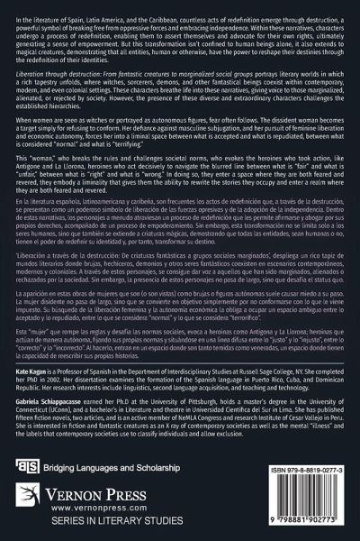 In the literature of Spain, Latin America, and the Caribbean, countless acts of redefinition emerge through destruction, a powerful symbol of breaking free from oppressive forces and embracing independence. Within these narratives, characters undergo a process of redefinition, enabling them to assert themselves and advocate for their own rights, ultimately generating a sense of empowerment. But this transformation isn't confined to human beings alone, it also extends to magical creatures, demonstrating that all entities, human or otherwise, have the power to reshape their destinies through the redefinition of their identities. 'Liberation through destruction: From fantastic creatures to marginalized social groups' portrays literary worlds in which a rich tapestry unfolds, where witches, sorcerers, demons, and other fantastical beings coexist within contemporary, modern, and even colonial settings. These characters breathe life into these narratives, giving voice to those marginalized, alienated, or rejected by society. However, the presence of these diverse and extraordinary characters challenges the established hierarchies. When women are seen as witches or portrayed as autonomous figures, fear often follows. The dissident woman becomes a target simply for refusing to conform. Her defiance against masculine subjugation, and her pursuit of feminine liberation and economic autonomy, forces her into a liminal space between what is accepted and what is repudiated, between what is considered "normal" and what is "terrifying." This "woman," who breaks the rules and challenges societal norms, who evokes the heroines who took action, like Antigone and La Llorona, heroines who act decisively to navigate the blurred line between what is "fair" and what is "unfair," between what is "right" and what is "wrong." In doing so, they enter a space where they are both feared and revered, they embody a liminality that gives them the ability to rewrite the stories they occupy and enter a realm where they are both feared and revered. En la literatura española, latinoamericana y caribeña, son frecuentes los actos de redefinición que, a través de la destrucción, se presentan como un poderoso símbolo de liberación de las fuerzas opresivas y de la adopción de la independencia. Dentro de estas narrativas, los personajes a menudo atraviesan un proceso de redefinición que les permite afirmarse y abogar por sus propios derechos, acompañado de un proceso de empoderamiento. Sin embargo, esta transformación no se limita solo a los seres humanos, sino que también se extiende a criaturas mágicas, demostrando que todas las entidades, sean humanas o no, tienen el poder de redefinir su identidad y, por tanto, transformar su destino. 'Liberación a través de la destrucción: De criaturas fantásticas a grupos sociales marginados', despliega un rico tapiz de mundos literarios donde brujas, hechiceros, demonios y otros seres fantásticos coexisten en escenarios contemporáneos, modernos y coloniales. A través de estos personajes, se consigue dar voz a aquellos que han sido marginados, alienados o rechazados por la sociedad. Sin embargo, la presencia de estos personajes no pasa de largo, sino que desafía el status quo. La aparición en estas obras de mujeres que son (o son vistas) como brujas o figuras autónomas suele causar miedo a su paso. La mujer disidente no pasa de largo, sino que se convierte en objetivo simplemente por no conformarse con lo que le viene impuesto. Su búsqueda de la liberación femenina y la autonomía económica la obliga a ocupar un espacio ambiguo entre lo aceptado y lo repudiado, entre lo que se considera "normal" y lo que se considera "terrorífico". Esta "mujer" que rompe las reglas y desafía las normas sociales, evoca a heroínas como Antígona y La Llorona [...]