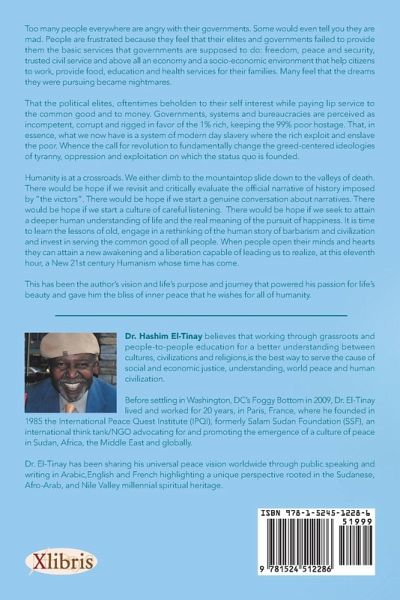 Too many people everywhere are angry with their governments. Some would even tell you they are mad. People are frustrated because they feel their elites and governments failed to provide them the basic services that governments are supposed to provide: freedom, peace and security, trusted civil service, and above all an economy and a socio-economic environment that help citizens to work, provide food, education and health services for their families. Many feel the dreams they were pursuing became nightmares. That the political elites, oftentimes beholden to their self-interest while paying lip service to the common good and to money, are bankrupting our moral capital and international goodwill. Governments, systems, and bureaucracies are perceived as incompetent, corrupt, and rigged in favor of the 1% rich, thus keeping the 99% poor hostage. In essence, many people believed that what we now have is a system of modern day slavery where the rich exploit and enslave the poor. Whence the call for revolution to fundamentally change the greed-centered ideologies of tyranny, oppression, and exploitation on which the status quo is founded. Humanity is at a crossroads. We either climb to the mountaintop or slide down to the valleys of death. ere would be hope if we revisit and critically evaluate the official narrative of history imposed by "the victors". There would be hope if we start a genuine conversation about narratives. There would be hope if we start a culture of careful listening. There would be hope if we seek to attain a deeper human understanding of life and the real meaning of the pursuit of happiness. It is time to learn the lessons of old, engage in a rethinking of the human story of barbarism and civilization, and invest in serving the common good of all people. When people open their minds and hearts, they can attain a new awakening and a liberation capable of leading us to realize, at this eleventh hour, a New 21st Century Humanism whose time has come. This has been the author's vision and life's purpose and journey that powered his passion for life's beauty and gave him the bliss of inner peace he wishes for all of humanity.