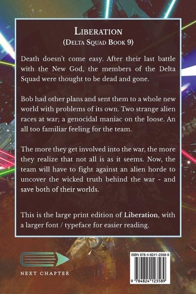 Death doesn't come easy. After their last battle with the New God, the members of the Delta Squad were thought to be dead and gone. Bob had other plans and sent them to a whole new world with problems of its own. Two strange alien races at war; a genocidal maniac on the loose. An all too familiar feeling for the team. The more they get involved into the war, the more they realize that not all is as it seems. Now, the team will have to fight against an alien horde to uncover the wicked truth behind the war - and save both of their worlds. This is the large print edition of Liberation, with a larger font / typeface for easier reading.