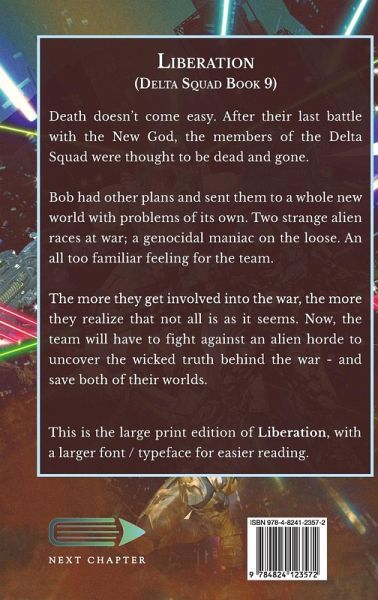 Death doesn't come easy. After their last battle with the New God, the members of the Delta Squad were thought to be dead and gone. Bob had other plans and sent them to a whole new world with problems of its own. Two strange alien races at war; a genocidal maniac on the loose. An all too familiar feeling for the team. The more they get involved into the war, the more they realize that not all is as it seems. Now, the team will have to fight against an alien horde to uncover the wicked truth behind the war - and save both of their worlds. This is the large print edition of Liberation, with a larger font / typeface for easier reading.