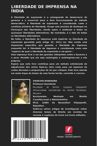 A liberdade de expressão é a salvaguarda da democracia do governo e é essencial para o bom funcionamento do método democrático. A liberdade de expressão é considerada como a condição primária da liberdade. Ocupa uma posição de destaque na hierarquia das liberdades, dando apoio e proteção a todas ou quaisquer liberdades alternativas. Na realidade, é a mãe de todas as liberdades alternativas.Na Índia, a liberdade de imprensa está implícita na liberdade de expressão garantida pelo artigo 19. 19(1) (a). Não existe uma disposição específica que garanta a liberdade de imprensa enquanto tal. A liberdade de imprensa é considerada como uma "espécie da qual a liberdade de expressão é um génio".Uma imprensa livre é um dos grandes intérpretes entre o Governo e o povo. Permitir que ela seja restringida é restringirmo-nos a nós próprios.Espero que este livro contribua para um método estruturado de adjudicação dos vários tópicos, bem como para um repensar de certas decisões e proposições de lei que critiquei. Este livro aborda um vasto leque de temas de uma forma lúcida, coerente e concisa.