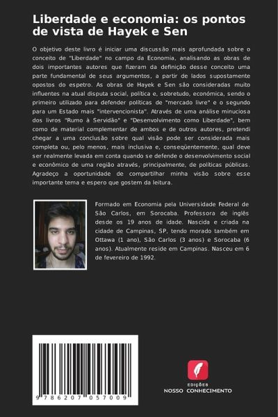 O objetivo deste livro é iniciar uma discussão mais aprofundada sobre o conceito de "Liberdade" no campo da Economia, analisando as obras de dois importantes autores que fizeram da definição desse conceito uma parte fundamental de seus argumentos, a partir de lados supostamente opostos do espetro. As obras de Hayek e Sen são consideradas muito influentes na atual disputa social, política e, sobretudo, económica, sendo o primeiro utilizado para defender políticas de "mercado livre" e o segundo para um Estado mais "intervencionista". Através de uma análise minuciosa dos livros "Rumo à Servidão" e "Desenvolvimento como Liberdade", bem como de material complementar de ambos e de outros autores, pretendi chegar a uma conclusão sobre qual visão pode ser considerada mais completa ou, pelo menos, mais inclusiva e, conseqüentemente, qual deve ser realmente levada em conta quando se defende o desenvolvimento social e econômico de uma região através, principalmente, de políticas públicas. Agradeço a oportunidade de compartilhar minha visão sobre esse importante tema e espero que gostem da leitura.