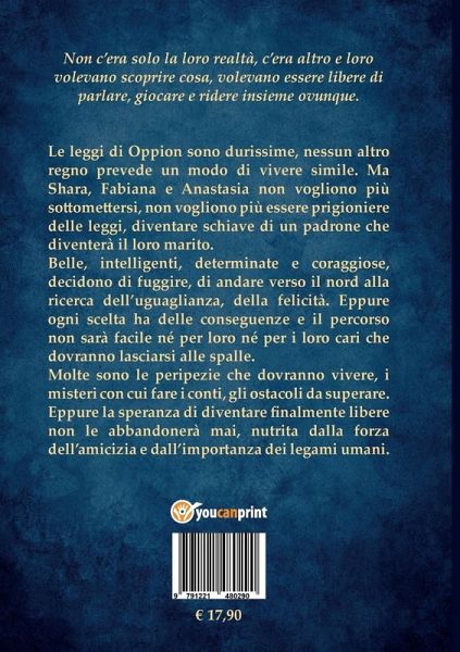 In fuga dalle leggi crudeli del loro regno che le avrebbero condannate ad essere vendute come schiave, Shara, Fabiana e Anastasia, tre coraggiose amiche inseparabili, intraprendono un viaggio rocambolesco verso la libertà. Ma il malvagio Teneb, spietato braccio destro del re, è sulle loro tracce, deciso a riportarle indietro ad ogni costo. Tra mille peripezie e colpi di scena, le ragazze attraverseranno regni sconosciuti, incontreranno nuove amicizie e saranno costrette a dividersi prima di ritrovarsi. Riuscirà la loro incrollabile amicizia a superare questa durissima prova? E i sentimenti puri e proibiti tra loro e i loro inseguitori riusciranno a sbocciare nonostante le avversità? Un'emozionante storia di speranza, giustizia e amore, in cui il desiderio di libertà e felicità sfida con audacia leggi disumane. Lasciati trasportare in questo viaggio indimenticabile in un debutto letterario che lascia presagire una promettente carriera narrativa!