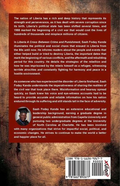 The nation of Liberia has a rich and deep history that represents its strength and perseverance, as it has dealt with severe corruption since its birth. Liberia's political state has been shifted several times, and 1988 marked the beginning of a civil war that would cost the lives of hundreds of thousands and misplace millions of citizens. In Liberia A Cross Between Crime and Punishment, Saah Foday Kanda illuminates the political and social chaos that ensued in Liberia from the 80s until now. He informs readers about the people and events that either helped build or tried to destroy Liberia, the important dates that mark the beginning of various conflicts, and the aftermath and rebuilding period for this country. He details the strategies of the rebellion and how he was imprisoned by the rebels himself as a refugee, witnessing terrible atrocities and constantly fighting for harmony and peace in a hostile environment. As someone who has experienced the disorder of Liberia firsthand, Saah Foday Kanda understands the imperativeness of sharing the realities of the civil war that took place there. Misinformation and hearsay spread quickly, so Saah knew his voice and eye-witness accounts had to be heard to provide accurate and reliable information on how his nation endured through its suffering and still stands tall in the face of adversity. Saah Foday Kanda has an extensive educational and leadership background, earning a graduate degree in general public administration from Capella University and pursuing two undergraduate degrees at the University of North Carolina at Charlotte. He has been involved with many organizations that strive for impactful social, political, and economic changes. He strives to continue to make the world a better and happier place for all.