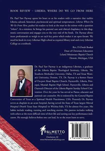 Dr. Paul Tarr Payway opens his heart to us his readers with a narrative that tackles Liberia cultural, historical, psychosocial, and spiritual temperament. Liberia: Where Do We Go From Here, pushes his readers to look at the man in the mirror with a question "where". As a minister, he brings his pastoral care and clinical chaplaincy in this diagnostic conversation and engages you to the very end of the book. Dr. Payway allows more professionals to weigh in on each key point which makes it an open forum. We need his book in every Liberian High school as required library read and every Liberian College as a textbook. Rev, D.Owah Boakai Dean of Christians Education Leland Missionary Baptist Church Detroit, Michigan, USA