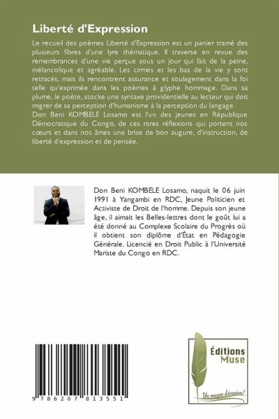 Le recueil des poèmes Liberté d'Expression est un panier tramé des plusieurs fibres d'une lyre thématique. Il traverse en revue des remembrances d'une vie perçue sous un jour qui fait de la peine, mélancolique et agréable. Les cirmes et les bas de la vie y sont retracés, mais ils rencontrent assurance et soulagement dans la foi telle qu'exprimée dans les poèmes à glyphe hommage. Dans sa plume, le poète, stocke une syntaxe providentielle au lecteur qui doit migrer de sa perception d'humanisme à la perception du langage. Don Beni KOMBELE Losamo est l'un des jeunes en République Démocratique du Congo, de ces rares réflexions qui portent nos coeurs et dans nos âmes une brise de bon augure, d'instruction, de liberté d'expression et de pensée.