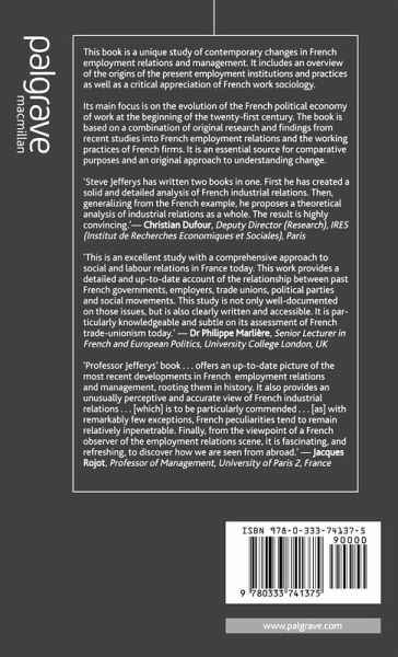 'Professor Jefferys book is particularly interesting on several accounts. First it offers an up to date picture of the most recent developments in French employment relations and management, but also roots them in history. Besides, it provides an unusually perceptive and accurate view of French industrial relations. This is to be particularly commended, for, if many Anglo-Saxon authors have offered excellent works about French society and its developments in general, this has often been less the case for French industrial relations. With remarkable but few exceptions, French peculiarities tend to remain relatively impenetrable across both the Channel and the Atlantic. Finally, from the standpoint of a French observer of the employment relations scene, it is fascinating, and refreshing to discover how we are seen from abroad.' - Jacques Rojot, Professor of Management, University of Paris