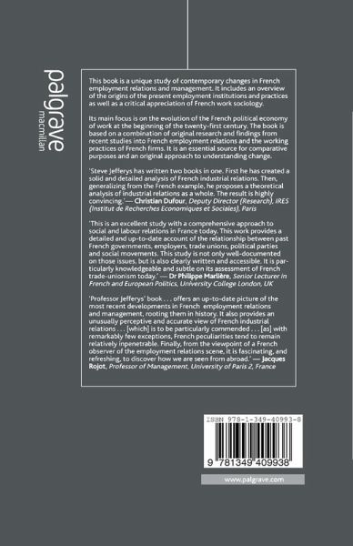 'Professor Jefferys book is particularly interesting on several accounts. First it offers an up to date picture of the most recent developments in French employment relations and management, but also roots them in history. Besides, it provides an unusually perceptive and accurate view of French industrial relations. This is to be particularly commended, for, if many Anglo-Saxon authors have offered excellent works about French society and its developments in general, this has often been less the case for French industrial relations. With remarkable but few exceptions, French peculiarities tend to remain relatively impenetrable across both the Channel and the Atlantic. Finally, from the standpoint of a French observer of the employment relations scene, it is fascinating, and refreshing to discover how we are seen from abroad.' - Jacques Rojot, Professor of Management, University of Paris