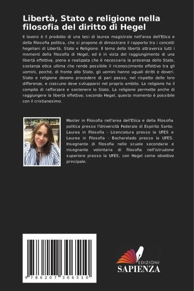 Il lavoro è il prodotto di una tesi di laurea magistrale nell'area dell'Etica e della Filosofia politica, che si propone di dimostrare il rapporto tra i concetti hegeliani di Libertà, Stato e Religione. Il tema della libertà attraversa tutti i momenti della filosofia di Hegel, ed è in vista del raggiungimento di una libertà effettiva, piena e realizzata che è necessaria la presenza dello Stato, sostanza etica ultima che rende possibile il riconoscimento effettivo tra gli uomini, poiché, di fronte allo Stato, gli uomini hanno uguali diritti e doveri. Stato e religione devono procedere di pari passo, nel rispetto delle loro differenze, e ciascuno deve svilupparsi nel proprio ambito. La religione ha il compito di rafforzare e sostenere lo Stato. La religione permette anche di raggiungere la libertà effettiva; secondo Hegel, questo momento è possibile con il cristianesimo.
