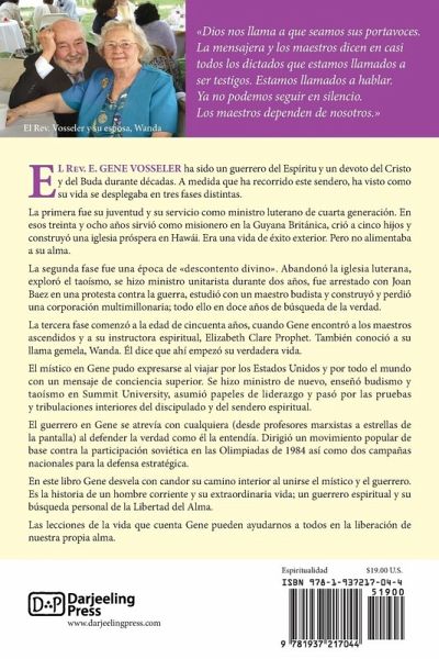 El Rev. E. Gene Vosseler ha sido un guerrero del Espíritu y un devoto del Cristo y del Buda durante décadas. A medida que ha recorrido este sendero, ha visto como su vida se desplegaba en tres fases distintas. La primera fue su juventud y su servicio como ministro luterano de cuarta generación. En esos treinta y ocho años sirvió como misionero en la Guyana Británica, crió a cinco hijos y construyó una iglesia próspera en Hawái. Era una vida de éxito exterior. Pero no alimentaba a su alma. La segunda fase fue una época de descontento divino. Abandonó la iglesia luterana, exploró el taoísmo, se hizo ministro unitarista durante dos años, fue arrestado con Joan Baez en una protesta contra la guerra, estudió con un maestro budista y construyó y perdió una corporación multimillonaria; todo ello en doce años de búsqueda de la verdad. La tercera fase comenzó a la edad de cincuenta años, cuando Gene encontró a los maestros ascendidos y a su instructora espiritual, Elizabeth Clare Prophet. También conoció a su llama gemela, Wanda. Él dice que ahí empezó su verdadera vida. El místico en Gene pudo expresarse al viajar por los Estados Unidos y por todo el mundo con un mensaje de conciencia superior. Se hizo ministro de nuevo, enseñó budismo y taoísmo en Summit University, asumió papeles de liderazgo y pasó por las pruebas y tribulaciones interiores del discipulado y del sendero espiritual. El guerrero en Gene se atrevía con cualquiera (desde profesores marxistas a estrellas de la pantalla) al defender la verdad como él la entendía. Dirigió un movimiento popular de base contra la participación soviética en las Olimpiadas de 1984 así como dos campañas nacionales para la defensa estratégica. En este libro Gene desvela con candor su camino interior al unirse el místico y el guerrero. Es la historia de un hombre corriente y su extraordinaria vida; un guerrero espiritual y su búsqueda personal de la Libertad del Alma. Las lecciones de la vida que cuenta Gene pueden ayudarnos a todos en la liberación de nuestra propia alma.