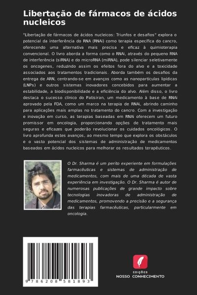 "Libertação de fármacos de ácidos nucleicos: Triunfos e desafios" explora o potencial da interferência do RNA (RNAi) como terapia específica do cancro, oferecendo uma alternativa mais precisa e eficaz à quimioterapia convencional. O livro aborda a forma como o RNAi, através do pequeno RNA de interferência (siRNA) e do microRNA (miRNA), pode silenciar seletivamente os oncogenes, reduzindo assim os efeitos fora do alvo e a toxicidade associados aos tratamentos tradicionais. Aborda também os desafios da entrega de ARN, centrando-se em avanços como as nanopartículas lipídicas (LNPs) e outros sistemas inovadores concebidos para aumentar a estabilidade, a biodisponibilidade e a eficiência do alvo. Além disso, o livro destaca o sucesso clínico do Patisiran, um medicamento à base de RNAi aprovado pela FDA, como um marco na terapia de RNAi, abrindo caminho para aplicações mais amplas no tratamento do cancro. Com a investigação e inovação em curso, as terapias baseadas em RNAi oferecem um futuro promissor em oncologia, proporcionando opções de tratamento mais seguras e eficazes que poderão revolucionar os cuidados oncológicos. O livro aprofunda estes avanços, ao mesmo tempo que explora os obstáculos e o vasto potencial dos sistemas de administração de medicamentos baseados em ácidos nucleicos para melhorar os resultados terapêuticos.