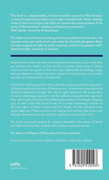 In this book, leading expert Eric Mack provides a rigorous and clear account of the philosophical principles of libertarianism. He offers accounts of three distinctive schools of libertarian thought, which he labels the natural rights approach, the cooperation to mutual advantage approach, and the indirect consequentialist approach. After examining the historical roots of these approaches in the thought of figures such as John Locke and David Hume, he provides illuminating accounts of the foundational arguments and the theories of economic justice offered by Robert Nozick and F.A. Hayek. He then examines a range of other debates, such as those surrounding the nature of the minimal state and those between critics and defenders of libertarianism.