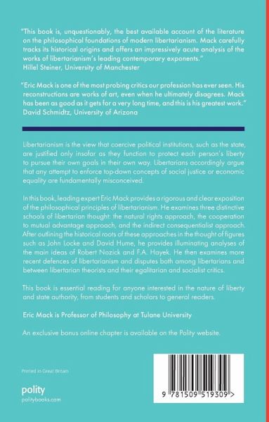 In this book, leading expert Eric Mack provides a rigorous and clear account of the philosophical principles of libertarianism. He offers accounts of three distinctive schools of libertarian thought, which he labels the natural rights approach, the cooperation to mutual advantage approach, and the indirect consequentialist approach. After examining the historical roots of these approaches in the thought of figures such as John Locke and David Hume, he provides illuminating accounts of the foundational arguments and the theories of economic justice offered by Robert Nozick and F.A. Hayek. He then examines a range of other debates, such as those surrounding the nature of the minimal state and those between critics and defenders of libertarianism.