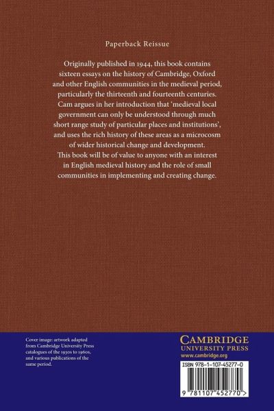 Originally published in 1944, this book contains sixteen essays on the history of Cambridge, Oxford and other English communities in the medieval period, particularly the thirteenth and fourteenth centuries. Cam argues in her introduction that 'medieval local government can only be understood through much short range study of particular places and institutions', and uses the rich history of these areas as a microcosm of wider historical change and development. This book will be of value to anyone with an interest in English medieval history and the role of small communities in implementing and creating change.