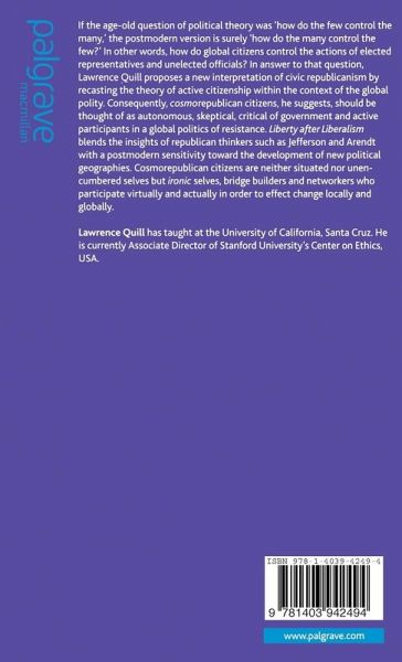 Liberty After Liberalism frees the concept of the active citizen from both the territorial confines of the nation-state and the limits imposed by republican, city-state models. Lawrence Quill advances a theory of global republicanism, one that is able to respond directly to the changing realities of political life. By adopting a publicly ironic approach to politics, Quill revives the idea of public freedom within a global context thereby providing an important supplement to contemporary theories of cosmopolitan democracy.