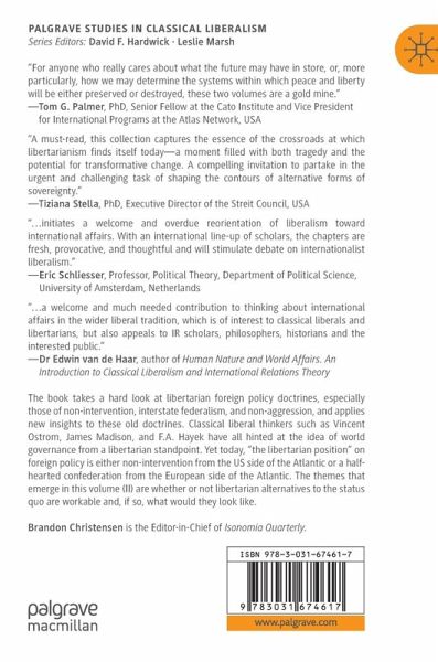 The book takes a hard look at libertarian foreign policy doctrines, especially those of non-intervention, interstate federalism, and non-aggression, and applies new insights to these old doctrines. Classical liberal thinkers such as Vincent Ostrom, James Madison, and F.A. Hayek have all hinted at the idea of world governance from a libertarian standpoint. Yet today, "the libertarian position" on foreign policy is either non-intervention from the US side of the Atlantic or a halfhearted confederation from the European side of the Atlantic. The themes that emerge in this volume (II) are whether or not libertarian alternatives to the status quo are workable and, if so, whatwould they look like.