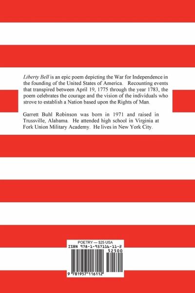 Liberty Bell is an epic poem depicting the War for Independence in the founding of the United States of America. Recounting events that transpired between April 19, 1775 through the year 1783, the poem celebrates the courage and the vision of the individuals who strove to establish a Nation based upon the Rights of Man. Table of Content Proem 1. Lexington 2. Concord 3. Travelling News 4. Bunker Hill: Digging In 5. Bunker Hill: The Red Waves 6. The Continental Army 7. Slow Work and Urgent Need 8. The Narrow Path of Freedom 9. Dorchester Heights 10. Changing Posts 11. To Form a New Government 12. Strategies and Contingencies 13. Declaring Independence 14. The Fire Boats 15. The Terrible Weight 16. The Battle of Long Island 17. Saving the Continental Army 18. The Keenness of the Edge 19. Kips Bay and Hell's Gate 20. A Narrow Escape 21. The Battle of Harlem Heights 22. Direction and Decision 23. The Battle of White Plains 24. The Thinning Ranks 25. The March through New Jersey 26. The Battle of Trenton 27. Staying a Step Ahead 28. The Battle of Princeton 29. Burgoyne's Plan 30. Fort Stanwix 31. Night Sortie 32. The Battle of Oriskany 33. Burgoyne's Foraging Party 34. The Battle of Bennington 35. Crossing the River 36. The Battle of Freeman Farm 37. The Foolish Fight Within 38. The Battle of Bemis Heights 39. Commission and Commitment 40. The Battle of Brandywine 41. Beaten yet Undefeated 42. The Battle of Germantown 43. Mud Island 44. Fort Mercer 45. Assignment and Reliance 46. The End of the Year of the Hangman 47. Valley Forge 48. The Conway Cabal 49. Feu-de-Joie 50. Balancing Judgement 51. Monmouth: Catastrophe 52. Monmouth: Victory 53. Colonel Clark's Frontier Expedition 54. Making a Way 55. The Sugar Camp 56. A Mind-Set for Victory 57. The Battle of Vincennes 58. John Paul Jones 59. Charleston 60. Changing Command 61. The Battle of Camden 62. Benedict Arnold's Treason 63. British Advance in the Carolinas 64. The Battle of King's Mountain 65. Attack upon Virginia 66. The Weather of War 67. The Battle of Cowpens 68. Maneuvering Armies 69. The Battle of Guilford Courthouse 70. Conditions of Development 71. Management and Expedience 72. The March to Yorktown 73. Tightening the Vise 74. Removing All Doubt 75. Victory 76. Independence Epilogue Acknowledgement bibliography index