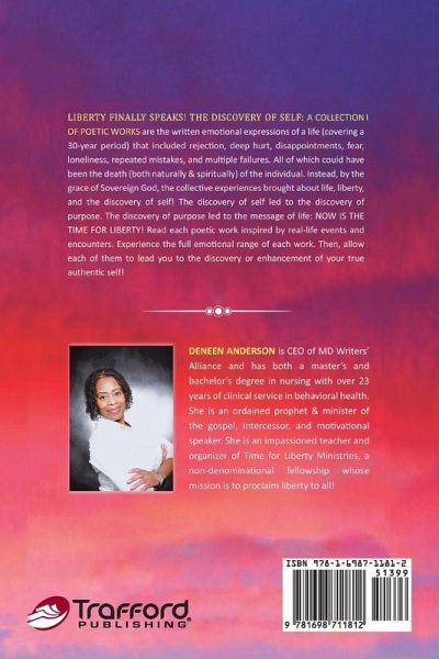 LIBERTY FINALLY SPEAKS! THE DISCOVERY OF SELF: A COLLECTION OF POETIC WORKS are the written emotional expressions of a life (covering a 30-year period) that included rejection, deep hurt, disappointments, fear, loneliness, repeated mistakes, and multiple failures. All of which could have been the death (both naturally & spiritually) of the individual. Instead, by the grace of Sovereign God, the collective experiences brought about life, liberty, and the discovery of self! The discovery of self-led to the discovery of purpose. The discovery of purpose led to the message of life: NOW IS THE TIME FOR LIBERTY! Read each poetic work inspired by real-life events and encounters. Experience the full emotional range of each work. Then, allow each of them to lead you to the discovery or enhancement of your true authentic self!