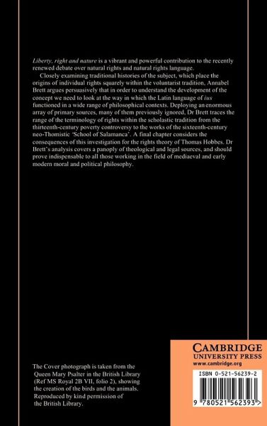Liberty, Right and Nature is a vibrant and powerful contribution to the recently renewed debate over natural rights and natural rights language. Annabel Brett argues persuasively that in order to understand the development of the concept we need to look at the way in which the Latin language of ius functioned in a wide range of philosophical contexts. Dr Brett traces the range of the terminology of rights within the scholastic tradition from the thirteenth-century poverty controversy to the works of the sixteenth-century neo-Thomistic 'School of Salamanca'. A final chapter considers the consequences of this investigation for the rights theory of Thomas Hobbes. Dr Brett's analysis covers a panoply of theological and legal sources, and should prove indispensable to all those working in the field of medieval and early modern moral and political philosophy.