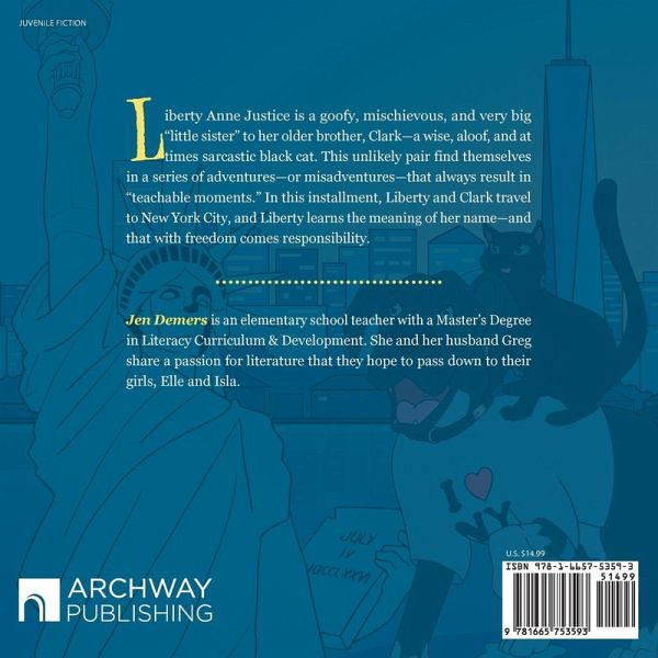Liberty Anne Justice is a goofy, mischievous, and very big "little sister" to her older brother, Clark--a wise, aloof, and at times sarcastic black cat. This unlikely pair find themselves in a series of adventures--or misadventures--that always result in "teachable moments." In this installment, Liberty and Clark travel to New York City, and Liberty learns the meaning of her name -- and that with freedom comes responsibility.