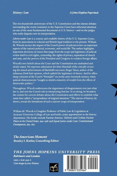 The two-hundredth anniversary of the U.S. Constitution and the intense debates surrounding the recent nominees to the Supreme Court have refocused attention on one of the most fundamental documents in U.S. history -- and on the judges who settle disputes over its interpretation. Liberty under Law is a concise and readable history of the U.S. Supreme Court, from its antecedents in colonial and British legal tradition to the present. William M. Wiecek surveys the impact of the Court's power of judicial review on important aspects of the nation's political, economic, and social life. The author highlights important decisions on issues that range from the scope and legitimacy of judicial review itself to civil rights, censorship, the rights of privacy, separation of church and state, and the powers of the President and Congress to conduct foreign affairs. Wiecek's own beliefs about the Court and the Constitution are unabashed and clearly stated. He expresses admiration for John Marshall while critically reviewing the mixed achievements of Marshall's successor, Roger Taney, author of the infamous Dred Scott opinion, which upheld the legitimacy of slavery. And he offers sharp criticism of the Court's "formalist" era in the early twentieth century, when judicial obstructionists "sought to shield a minority of wealth from the effects of democratic politics." Throughout, Wiecek underscores the importance of disagreements over just what law is, and over the Court's role in interpreting that law. In so doing, he broadens the context for current debates about the Constitution and efforts to establish what some have called a "jurisprudence of original intention." The mirror of history, heshows, reveals the limitations of such a narrow scope of interpretation.