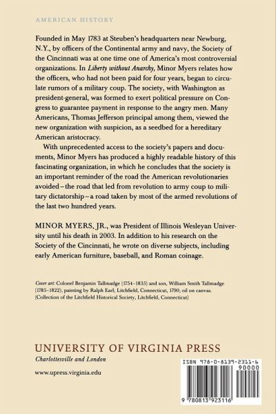 Founded in May 1783 at Steuben's headquarters near Newburg, N.Y., by officers of the Continental army and navy, the Society of the Cincinnati was at one time one of America's most controversial organizations. In Liberty without Anarchy, Minor Myers relates how the officers, who had not been paid for four years, began to circulate rumors of a military coup. The society, with Washington as President-General, was formed to exert political pressure on Congress to guarantee payment in response to the angry men. Many Americans, Thomas Jefferson principal among them, viewed the new organization with suspicion, as a seedbed for a hereditary American aristocracy. As Myers points out, the fears were well-founded: many society members were monarchists, and in 1786 Steuben himself wrote to Prince Henry of Prussia inquiring whether he might be interested in becoming king of the United States. Prince Henry declined. The interest in monarchy ended with the adoption of the federal Constitution in 1787, with many society members as delegates to the Convention, but it was not until 1827 that the original pay dispute was resolved and the officers awarded a pension. With unprecedented access to the society's papers and documents, Minor Myers has produced a highly readable history of this fascinating organization, in which he concludes that the Society is an important reminder of the road the American revolutionaries avoided--the road that led from revolution to army coup to military dictatorship--a road taken by most of the armed revolutions of the last two hundred years. tag: The history of how a powerful and potentially subversive group of officers made the choice for liberty during the Revolutionary War