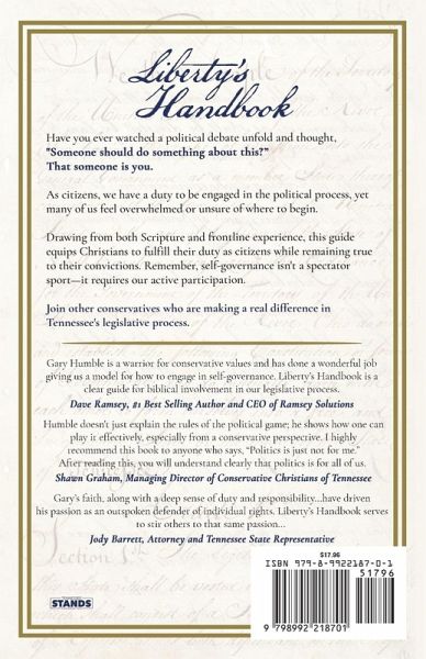 Have you ever watched a legislative debate unfold and thought, "Someone should do something about this?" That someone is you. As believers, we're called to be engaged citizens, yet many feel overwhelmed by the legislative process or unsure where to begin. I've been there too. When my own journey of civic engagement began, I discovered that effective advocacy isn't just for political insiders or career activists. It's for parents concerned about their children's future, pastors protecting religious liberty, and everyday citizens answering the call to be faithful stewards of our constitutional republic. That's why I wrote this handbook-to share what I've learned on the frontlines of defending conservative values in Tennessee's legislature. Drawing from both Scripture and hands-on experience, this guide walks you through the legislative process in practical, actionable terms. You'll learn not just how bills become laws but how to influence that process effectively while staying true to your faith and principles. From working with legislators, testifying in committees, and building coalitions, you'll discover proven strategies that work in the real world. This handbook is perfect for: Parents teaching their children about civic responsibility Church groups seeking to engage meaningfully in public policy Individual believers answering the call to civic dutyAnyone ready to move from concern to effective action Inside, you'll find: ¿ Biblical foundations for civic engagement ¿ Clear explanations of legislative procedures ¿ Step-by-step guidance for effective advocacy ¿ Practical tools for protecting religious liberty Whether you're gathering with other families to study government, organizing your church's civic engagement, or simply seeking to be a more effective voice for truth, this handbook provides the knowledge and tools you need to get started. Self-governance isn't a spectator sport-it requires our active participation. When Christians step back from civic engagement, we leave crucial decisions about our families, faith, and freedoms to others. But when we step forward in wisdom and truth, we fulfill our duty to promote righteous governance and preserve liberty for future generations. Join fellow conservatives who are making a real difference in Tennessee's legislative process. Together, we can be faithful stewards of the constitutional republic God has entrusted to us. Liberty's Handbook will show you how to engage in this vital work today.