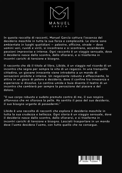 In questa raccolta di racconti, Manuel García cattura l'essenza del desiderio maschile in tutta la sua forza e complessità. Le storie sono ambientate in luoghi quotidiani - palestre, officine, strade - dove uomini veri, ruvidi e virili, si incontrano e si scontrano, accendendo passioni improvvise e intense. Ogni racconto è un viaggio sensuale, dove il desiderio nasce dallo scontro, dallo sfiorarsi, e si trasforma in incontri carichi di tensione e bisogno.Il racconto che dà il titolo al libro, Libido, è un viaggio nel ricordo di un incontro che segna per sempre la vita di un ragazzo. In una tranquilla cittadina, un giovane innocente viene introdotto a un mondo di sensazioni proibite e intense. Un negoziante robusto e affascinante, lo attira in un gioco di potere e desiderio, dove il confine tra innocenza e esperienza si dissolve. La cantina umida e buia diventa il teatro di un incontro che cambierà per sempre la percezione del piacere e del dolore."Il suo corpo robusto e sudato premuto contro di me, il suo respiro affannoso che mi sfiorava la pelle. Ho sentito il peso del suo desiderio, il suo bisogno urgente di possedermi."Libido è una raccolta di racconti che esplora il desiderio maschile in tutta la sua crudezza e bellezza. Ogni storia è un viaggio sensuale, dove il desiderio nasce dallo scontro, dallo sfiorarsi, e si trasforma in incontri carichi di tensione e bisogno. Lasciati trasportare in un mondo dove l'uomo desidera l'uomo, con tutto quello che ne consegue.