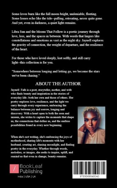 Libra Sun and the Moons That Follow is a poetic odyssey through love, loss, and the spaces in between. Jaynell Falk captures the ache of longing, the weight of goodbyes, and the quiet light that lingers after heartbreak. Each verse shines like a constellation--guiding readers through the gravity of connection and the resilience of the human spirit. With raw emotion and celestial beauty, this collection speaks to those who have loved deeply, grieved softly, and still carry hope. Step into a universe where every goodbye leaves a star, and every heartache becomes part of your sky.