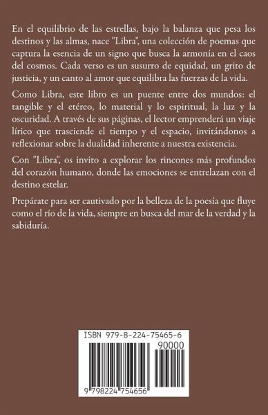 En el equilibrio de las estrellas, bajo la balanza que pesa los destinos y las almas, nace "Libra", una colección de poemas que captura la esencia de un signo que busca la armonía en el caos del cosmos. Cada verso es un susurro de equidad, un grito de justicia, y un canto al amor que equilibra las fuerzas de la vida. Como Libra, este libro es un puente entre dos mundos: el tangible y el etéreo, lo material y lo espiritual, la luz y la oscuridad. A través de sus páginas, el lector emprenderá un viaje lírico que trasciende el tiempo y el espacio, invitándonos a reflexionar sobre la dualidad inherente a nuestra existencia. Con "Libra", os invito a explorar los rincones más profundos del corazón humano, donde las emociones se entrelazan con el destino estelar. Prepárate para ser cautivado por la belleza de la poesía que fluye como el río de la vida, siempre en busca del mar de la verdad y la sabiduría.