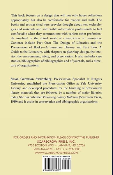Susan Garretson Swartzburg, Preservation Specialist at Rutgers University, established the Preservation Office at Yale University Library, and developed procedures for the handling of deteriorated library materials that are followed by a number of major libraries today. She has published Preserving Library Materials (Scarecrow Press, 1980) and is active in conservation and bibliographic organizations. Holly J. Bussey (AB, Wheaton College; MLIS, Rutgers), Vice President and Manager, Ayer Information Center, New York, hold responsibility for all secondary research in Ayer's worldwide offices. She has been active in library planning and space design, has consulted on several renovation projects, including the Staten Island Historical Society Library, and has guest-edited a thematic issue of Special Libraries. Frank Garretson, AIA, has an architectural practice in Sheffield, MA specializing in renovations and additions to older homes. Formerly a city planner with a special interest in writing and implementing preservation plans, he received Classical America's Arthur Ross Award in 1988 for designing homes in the regional vernacular.