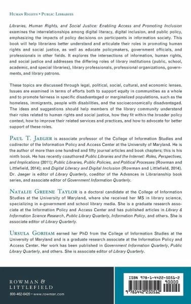 Paul T. Jaeger is associate professor and diversity officer of the College of Information Studies and Co-Director of the Information Policy and Access Center at the University of Maryland. Dr. Jaeger's research focuses on the ways in which law and public policy shape information behavior, particularly for underserved populations. He is the author of more than one hundred and fifty journal articles and book chapters. This is his ninth book. His other recent books are Information Worlds: Social Context, Technology, & Information Behavior in the Age of the Internet (Routledge, 2010) with Gary Burnett; and Public Libraries and the Internet: Roles, Perspectives, and Implications (Libraries Unlimited, 2011) with John Carlo Bertot and Charles R. McClure; Disability and the Internet: Confronting a Digital Divide (Lynne Rienner, 2012); Public Libraries, Public Policies, and Political Processes: Serving and Transforming Communities in Times of Economic and Political Constraint (Rowman and Littlefield, 2014) with Ursula Gorham, John Carlo Bertot, and Lindsay C. Sarin; and Digital Literacy and Digital Inclusion: Information Policy and the Public Library (Rowman and Littlefield, 2014) with Kim M. Thompson, Natalie Greene Taylor, Mega Subramaniam, and John Carlo Bertot. His research has been funded by the Institute of Museum & Library Services, the National Science Foundation, the American Library Association, the Smithsonian Institution, and the Bill & Melinda Gates Foundation, among others. Dr. Jaeger is Editor of Library Quarterly, Co-Editor of the Advances in Librarianship Book Series, and Associate Editor of Government Information Quarterly. Natalie Greene Taylor is a doctoral candidate at the College of Information Studies at the University of Maryland, where she also received her Masters of Library Science, specializing in e-government and school library media. She is a Graduate Research Associate at the Information Policy & Access Center (iPAC) where her research has focused on partnerships between libraries and government agencies and the role of school libraries in improving adolescent health and information literacy. Her research interests also include the role of policy in limiting or promoting youth information access, and her dissertation explores adolescents' experiences with digital government health information. She has published articles in Library & Information Science Research, Public Library Quarterly, Information Polity, and International Journal of Public Administration in the Digital Age, among others, and co-authored the book Digital Literacy and Digital Inclusion: Information Policy and the Public Library. She is also an Associate Editor of Library Quarterly. Ursula Gorham is a doctoral candidate in the College of Information Studies and a Graduate Research Associate at the Information Policy and Access Center (iPAC). She holds a law degree, as well as graduate degrees in library science and public policy, from the University of Maryland. She is admitted to practice law in Maryland and, prior to beginning the doctoral program, served as a law clerk in Maryland appellate and federal bankruptcy courts. Ursula's work at iPAC has focused on e-government partnerships in public libraries and the role of libraries in public policy and political processes. Her research interests also include the accessibility of legal information and court documents, with an emphasis on self-represented litigants, and her dissertation will explore the use of technology to expand access to justice for low-income individuals in the United States. Her work has been published in Government Information Quarterly, Public Library Quarterly, Journal of Open Access to Law, Information Polity, and International Journal of Public Administration in the Digital Age. She is an Associate Editor of Library Quarterly.
