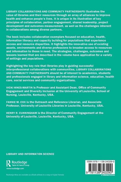 Part I - Theoretical Foundations 1. Introduction Vicki Hines-Martin 2. Unrecognized Roles of Libraries in Collaborations to Improve Communities Fannie M. Cox 3. Interprofessional Practice and Collaboration Vicki Hines-Martin 4. Communities and Community Engagement Henry R. Cunningham Part II - Project Exemplars Section A - Information Literacy 5. Introduction Fannie M. Cox 6. Building Wellness Partnerships in Graduate Library and Information Science (LIS) Education Loriene Roy, Yan Zhang, and Nora Rose 7. Information Literacy and the Undergraduate Curriculum: Engaging Faculty and Enhancing Student Learning Hugh Burkhart 8. Fiscal Fitness Through Financial Literacy Rosalind K. Lett 9. Expanding Health Information Outreach through Academic Health Science Partners Elizabeth Kiscaden and Jacqueline Leskovec Section B - Education 10. Introduction: Libraries Addressing the Educational Needs of the Community Henry R. Cunningham 11. Information Literacy through Service-Learning Michael F. Russo 12. Engaged, Educated and Entertained: Employing a Facilitated Discussion Model Marilyn Harhai 13. The Carver Cubs Summer Book Club: A Reciprocal Collaboration Between a Neighborhood Library and a Graduate Elementary Teacher Preparation Program Estanislado S. Barrera IV, Kim Skinner, and Brandon Reilly 14. The Monthly Health Talk: How a consumer health library became a hub for a successful health education event through partnerships and community engagement Rita Kang, Phyllis Mancini, Valeria Raivich, and Miu Lin Wong Section C - Health and Behavior 15. Introduction Vicki Hines-Martin 16. Dog in Residence: An Interprofessional Wellness Program at an Academic Health Sciences Library Gail Y. Hendler and Julia Havey 17. Free Food at the Library: Becoming a Point of Access for Vulnerable Families Elizabeth Lynch and Kelly MacGregor 18. Healthy Start, Healthy Future for All: Building a Community Coalition to Early Childhood Health Ophelia T. Morey, Mary K. Comtois, Christy Panagakis 19. Team Vittles: A Made-from-Scratch Approach to Tackling Childhood Hunger in Ohio Shane Hoffman, Janet Ingraham-Dwyer, JoLynn Wheatley, Sarah Schaff 20. The Ask: Partnering to Connect At-Risk Teens with Sexual Health Resources Elizabeth Lynch and Rebecca McFarland 21. Physical Activity and Libraries: How Library-Recreation Partnerships Contribute to Active Living Noah Lenstra Section D - Capacity Building 22. Introduction: Building Community Capacity through Partnerships and Collaborations Henry R. Cunningham 23. Hoop City Blooms: Mason Square Community Garden and Public Health Initiative Caitlin Kelley and Ellen Sulzycki 24. Making Agency Funding Work for Your Community Talicia Tarver, Montie' Dobbins, William Olmstadt, David Duggar, and Julia M. Esparza 25. Patient Empowerment: A Partnership between Academia, Community-Based Organizations, and Public Libraries Kara Burke, Elizabeth Irish, Enid Geyer, Ingrid Allard, Linda Miller, Maria Buhl, and Lauren Manning 26. Transformative Global Health Education and Community Empowerment Moira Rogers, Robin Young, Cecilia Uribe de Chavez, and Wilfrido Torres Part III - Perspectives, Challenges, and Future Directions 27. Perspectives, Challenges, and Future Directions Vicki Hines-Martin, Henry R. Cunningham, and Fannie M. Cox