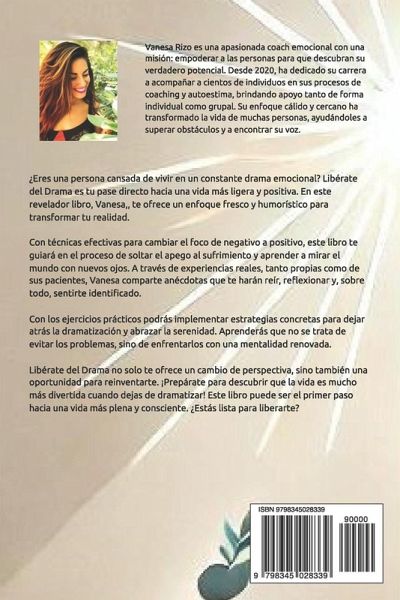 En este libro, Vanesa Rizo, coach emocional especializada en autoestima, comparte su método transformador para superar patrones de pensamiento negativos y vivir una vida más plena. Con cinco años de experiencia ayudando a personas a conectar con su esencia, Vanesa nos muestra cómo cambiar el foco de lo negativo a lo positivo y dejar atrás la tendencia a dramatizar, un hábito que muchas veces nos impide ver la belleza en el presente creando una perspectiva constructiva y optimista. A través de historias reales de pacientes y vivencias personales, Vanesa revela herramientas de Coaching, ejercicios prácticos y técnicas de reprogramación de creencias que ayudan a soltar el apego al sufrimiento. Este libro invita a sus lectores a abrazar una vida sin dramas, redescubriendo el poder de la autoestima y la paz interior con un toque de humor. Si buscas un cambio profundo en la forma de afrontar tus emociones y una guía para empoderarte y alcanzar una felicidad más genuina, este libro ameno y práctico, te dará el impulso y las estrategias para comenzar hoy mismo.