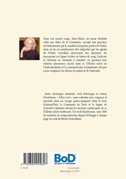 Pour Catherine Litzler, le bien le plus précieux est la liberté. Dans son premier livre, elle a voulu rendre un hommage vibrant aux insurgés de la Commune et plus particulièrement à un de ses ancêtres dont l'histoire s'est perdue aux confins de la Nouvelle Calédonie.Entre chronique intimiste, récit historique et roman d'aventures, "Libre à toi" entraîne le lecteur dans un voyage spatio-temporel entre le Gers d'aujourd'hui, la Commune de Paris et le bagne de Nouméa durant les derniers soubresauts d'un XIXème siècle tonitruant.Un récit flamboyant duquel s'échappe à chaque page un vent de liberté ébouriffant.