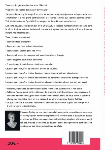 Ce livre est une invitation à prendre votre place dans ce monde et à vous épanouir malgré vos imperfections.Vous y trouverez comment :- Oser faire face à l'inconnu- Oser créer des liens solides et durables- Oser passer à l'action pour vos rêves- Oser prendre soin de vous pour retrouver bien-être et énergie- Oser s'oxygéner pour mieux performerEt aussi un petit bout de mon histoire personnelle.L'audace pour moi, c'est se choisir et arrêter de s'oublier.L'audace pour moi, c'est choisir d'avancer malgré les peurs et non abandonner.L'audace pour moi, c'est choisir d'être entouré de personnes inspirantes et respectueuses.L'audace pour moi, c'est choisir de croire en l'avenir à tout âge et quel que soit son passé.
