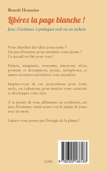 "Libérez la page blanche !" est un recueil de jeux d'écritures à la portée de tous. Ces pistes visent avant tout le plaisir de jouer avec les mots.