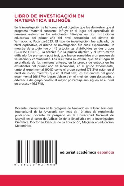En la investigación se ha formulado el objetivo que fue demostrar que el programa ¿material concretö influye en el logro del aprendizaje de números enteros en los estudiantes Bilingües en dos instituciones educativas del primer año del nivel secundario del distrito de Yarinacocha, Pucallpa-2023. El tipo de investigación fue aplicada, de nivel explicativo, el diseño de investigación fue cuasi experimental; la muestra de estudio fueron 45 estudiantes distribuidos en dos grupos (GC=15; GE=30). La técnica fue la prueba objetiva y el instrumento utilizado fue pre test y post test, que fueron sometidos a un proceso de validación y confiabilidad. Los resultados muestran, que, en el logro de aprendizaje de los números enteros, en la prueba de entrada en los estudiantes del primer año de secundaria, en el grupo experimental, tanto el experimental (90%) como el grupo control (73.3%) están en el nivel de inicio; mientras que en el Post test, los estudiantes del grupo experimental (66.67%) logran ubicarse en el nivel de logro destacado, a diferencia del grupo control el mayor porcentaje aún siguen en el nivel en proceso (46.67%).