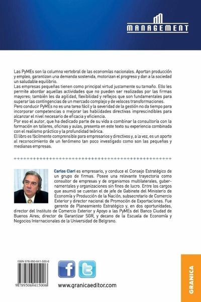 Las PyMEs son la columna vertebral de las economías nacionales. Aportan producción y empleo, garantizan una demanda sostenida, motorizan el progreso y dan a la sociedad un saludable equilibrio. Las empresas pequeñas tienen como principal virtud justamente su tamaño. Ello les permite abordar aquellas actividades que no pueden ser realizadas por las firmas mayores; también les da agilidad, flexibilidad y reflejos que son fundamentales para sobrepasar las contingencias de un mercado complejo y de veloces transformaciones. Pero conducir PyMEs no es una tarea fácil y la severidad de la gestión no da tiempo para incorporar competencias o mejorar las habilidades directivas imprescindibles para alcanzar el nivel necesario de eficacia y eficiencia. Por eso, el autor, que ha dedicado parte de su vida a combinar la consultoría con la formación en talleres, oficinas y aulas, presenta en este texto su experiencia combinada con el realismo práctico y la profundidad teórica. El libro es fácilmente comprensible para empresarios y directivos y, a la vez, es un aporte al reconocimiento de un fenómeno tan poco investigado como son las empresas PyMEs. Carlos Cleri tiene una variada experiencia. Actualmente es el jefe de Gabinete de Asesores de la ministra de Economía y Producción de la Argentina, presidente de la Fundación Garantizar el Desarrollo, miembro del Consejo Académico de la Fundación Utopías y coordinador del Programa para Directivos Propietarios de Evade Business School - Argentina. Fue miembro del Servicio Exterior, director de Promoción de Exportaciones y subsecretario de Comercio Exterior del Ministerio de Economía de la Nación, trabajó en el Banco de la Ciudad de Buenos Aires, en Garantizar SGR, ha sido presidente de la Sociedad Latinoamericana de Estrategia y tiene una profusa actividad como PyME, consultor de empresas y académico.