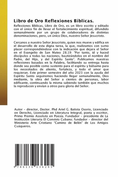 Reflexiones Bíblicas, Libro de Oro, es un libro escrito y editado con el único fin de llevar el fortalecimiento espiritual, difundido semanalmente por un grupo de colaboradores de distintas denominaciones, pero, un único Dios, nuestro Señor Jesucristo.Cercanos a nuestro Señor Jesucristo, quien nos mueve y edifica en el desarrollo de esta digna tarea, la que, realizamos con sumo placer correspondiéndose con la indicación que dejara el Señor en el Evangelio de San Mateo 28.19: "Por tanto, id y haced discípulos a todas las naciones, bautizándolos en el nombre del Padre, del Hijo, y del Espíritu Santo". Publicamos nuestras reflexiones basadas en la Palabra, facilitando su entrega hasta donde sea posible como sustento para el espíritu y bálsamo para los necesitados de aliento, fortaleza, y todo el amor que requieran. Este primer semestre del año 2023 con la ayuda del Espíritu Santo seguiremos haciendo llegar semanalmente, Dios mediante, la obra del Señor a cientos de personas, labor edificante, continuando la misma sabiendo también que muchos la reproducen y envían a otros para gloria del Señor.
