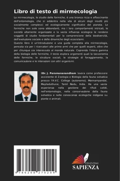 La mirmecologia, lo studio delle formiche, è una branca ricca e affascinante dell'entomologia, che si addentra nella vita di alcuni degli insetti più socialmente complessi ed ecologicamente significativi del pianeta. Le formiche non solo sono abbondanti, ma i loro comportamenti intricati, le società altamente organizzate e la vasta influenza ecologica le rendono soggetti di studio fondamentali per la comprensione della biodiversità, dell'evoluzione sociale e delle dinamiche degli ecosistemi.Questo libro è un'introduzione e una guida completa alla mirmecologia, pensata sia per i ricercatori alle prime armi che per quelli esperti, oltre che per chiunque sia interessato al mondo naturale. Coprendo l'intera gamma della biologia delle formiche, il testo esplora argomenti quali la tassonomia delle formiche, le strutture sociali, le strategie di foraggiamento, la comunicazione e le interazioni con altri organismi.