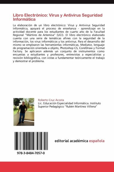 La elaboración de un libro electrónico: Virus y Antivirus Seguridad Informática, apoyará el proceso de enseñanza - aprendizaje en la actividad docente para los estudiantes de cuarto año de la Facultad Regional Mártires de Artemisa (UCI). El libro electrónico elaborado cuenta con una serie de temáticas afines con la seguridad de la información, los virus informáticos y los antivirus. Para el desarrollo del mismo se emplearon las herramientas informáticas, Mediator, lenguaje de programación orientada a objeto, Photoshop CS, CorelDraw y Format Factory. Se aplicaron además un conjunto de instrumentos como encuestas a estudiantes y profesores, entrevistas a especialistas y revisión bibliográfica, con vistas a fundamentar teóricamente el trabajo y demostrar el problema.