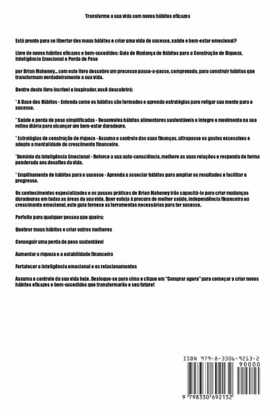 Trasformate la vostra vita con nuove abitudini efficaci Siete pronti a liberarvi dalle cattive abitudini e a creare una vita di successo, salute e benessere emotivo? Libro sulle Nuove Abitudini Efficaci di Successo: Cambiare le abitudini per costruire la ricchezza, l'intelligenza emotiva e la perdita di peso Guida di Brian Mahoney... con questo libro scoprirete un processo collaudato, passo dopo passo, per costruire abitudini che trasformino veramente la vostra vita. All'interno di questo libro sorprendente e stimolante, scoprirete: * Il fondamento delle abitudini - Capire come si formano le abitudini e imparare le strategie per ricablare la vostra mente per il successo. * Salute e perdita di peso semplificate - Sviluppate abitudini alimentari sostenibili e integrate il movimento nella vostra routine quotidiana per raggiungere un benessere duraturo. * Strategie per la costruzione della ricchezza - Prendete il controllo delle vostre finanze, superate la spesa eccessiva e adottate la mentalità della crescita finanziaria. *Padronanza dell'intelligenza emotiva - Rafforzate la vostra autoconsapevolezza, migliorate le vostre relazioni e rispondete in modo ponderato alle sfide della vita. * Habit Stacking for Success - Imparate a collegare tra loro le abitudini per amplificare i risultati e facilitare i progressi. Le intuizioni degli esperti di Brian Mahoney e i passi praticabili vi permetteranno di creare cambiamenti duraturi in ogni area della vostra vita. Se state cercando di migliorare la vostra salute, l'indipendenza finanziaria o la crescita emotiva, questa guida vi fornisce gli strumenti necessari per avere successo. Perfetta per chiunque voglia Rompere le cattive abitudini e costruirne di migliori Ottenere una perdita di peso sostenibile Accrescere la ricchezza e la stabilità finanziaria Rafforzare l'intelligenza emotiva e le relazioni Prendete il controllo della vostra vita oggi stesso. Scorrete verso l'alto e fate clic su "Acquista ora" per iniziare a costruire nuove abitudini efficaci e di successo che trasformeranno il vostro futuro!